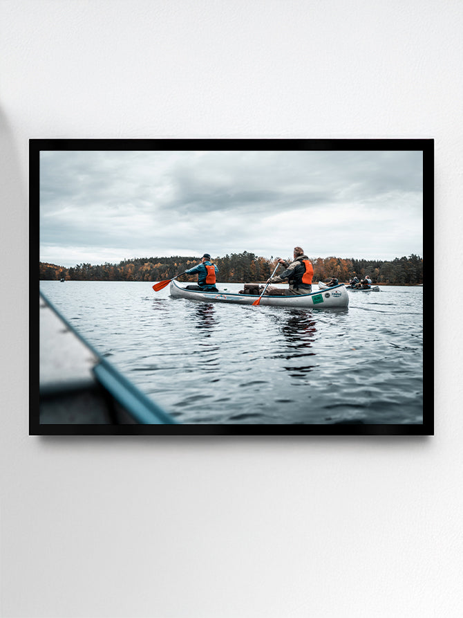 Stilheden brudt af padletag – et øjeblik fanget i Sveriges spejlblanke søer, hvor tid og tanker driver væk med kanoerne.