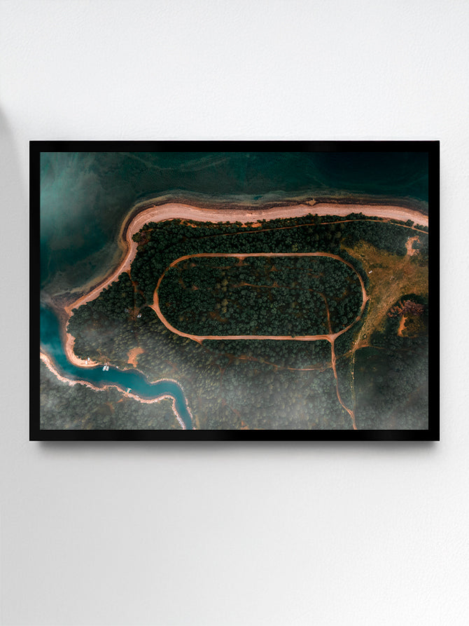 Dette billede er taget med drone i Norge og er et af mine favorit top-down skud. Fra luften får man et helt andet perspektiv – næsten som at se et maleri. Midt i det naturlige landskab træder den runde hesteløbsbane tydeligt frem, omgivet af vand og grønne nuancer, der skaber en smuk kontrast. Jeg elsker, hvordan billedet balancerer mellem det menneskeskabte og det vilde – og hvordan dronen giver mulighed for at fange mønstre og former, man aldrig ville se fra jorden.